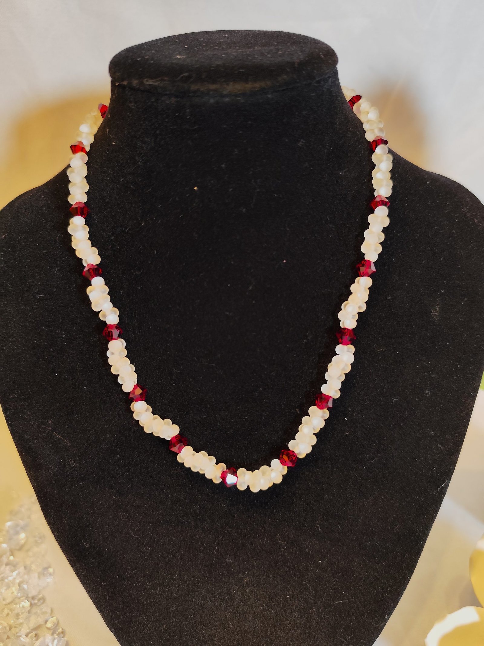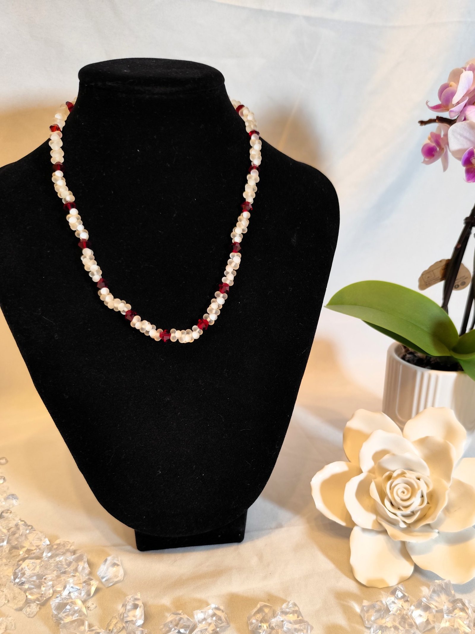 Verleihen Sie Ihrem Look mit dieser eleganten Kette, die aus matt weißen Farfalle-Perlen und edlen roten Facettenperlen gefertigt ist, einen Hauch von Raffinesse. Die Kette hat eine Gesamtlänge von 38 cm mit einem zusätzlichen 6 cm langen Verlängerungskettchen, das Ihnen die Möglichkeit gibt, die Kette individuell anzupassen. Ein praktischer Karabinerverschluss sorgt für sicheren Halt.