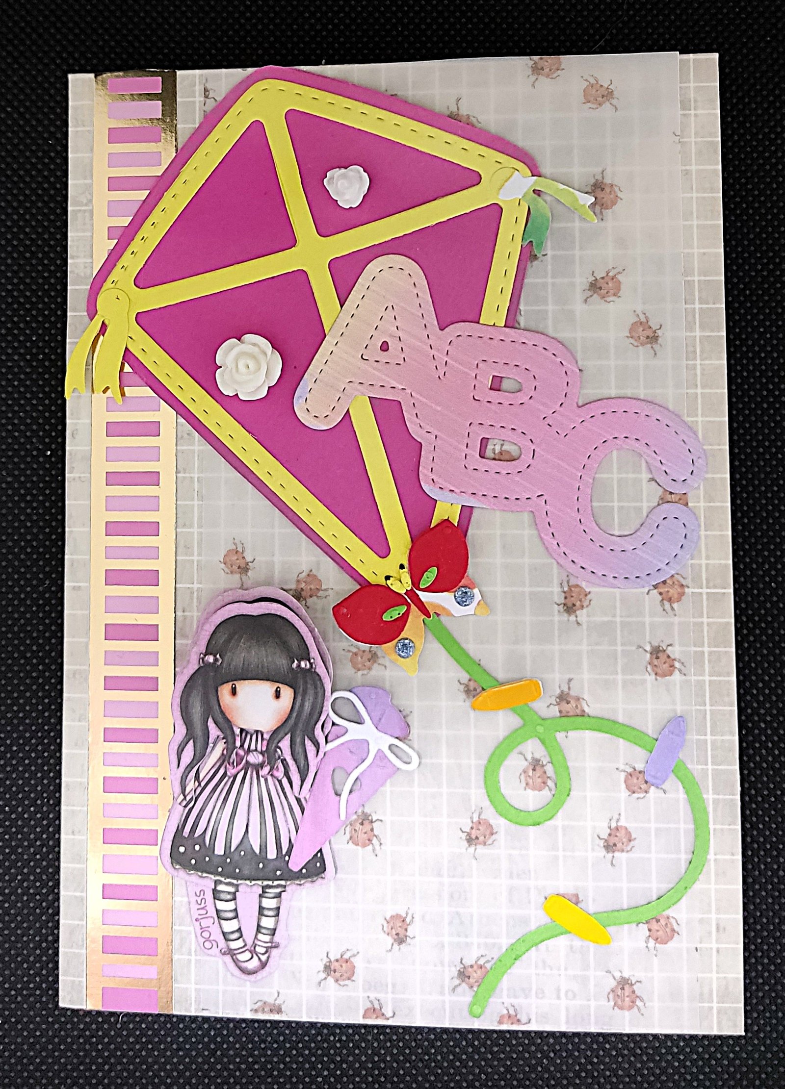 Karte in beige-liniert und kariert, Kartenaufleger: weißes Transparentpapier mit Marienkäfern, Motiv: pink-gelber Drachen, ABC in passendem Farbverlauf, mit Gorjuss-Puppe (Santoro™) in 3D, Verzierung: rosa Streifen-Bordüre mit Goldfoliendruck, Resin-Röschen, Innenseite weiß mit grünem Schriftzug „Alles Gute zur Einschulung“, passender beige-braun gestreifter Umschlag