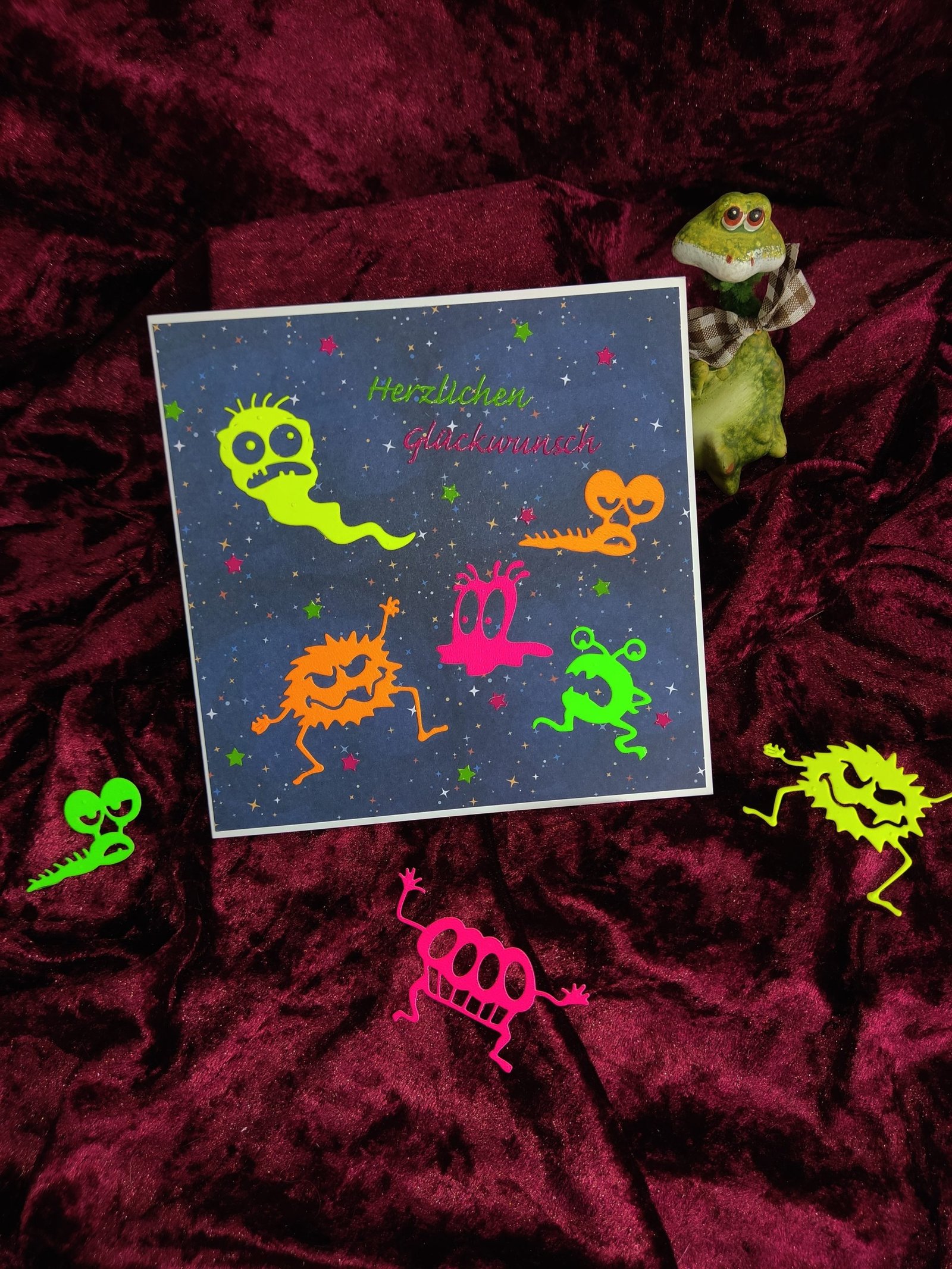 Karte in weiß, Kartenaufleger dunkelblau mit bunten Sternchen, Motiv: verschiedene Monster in Neonfarben, Schriftzug “Herzlichen Glückwunsch”, weißer Umschlag