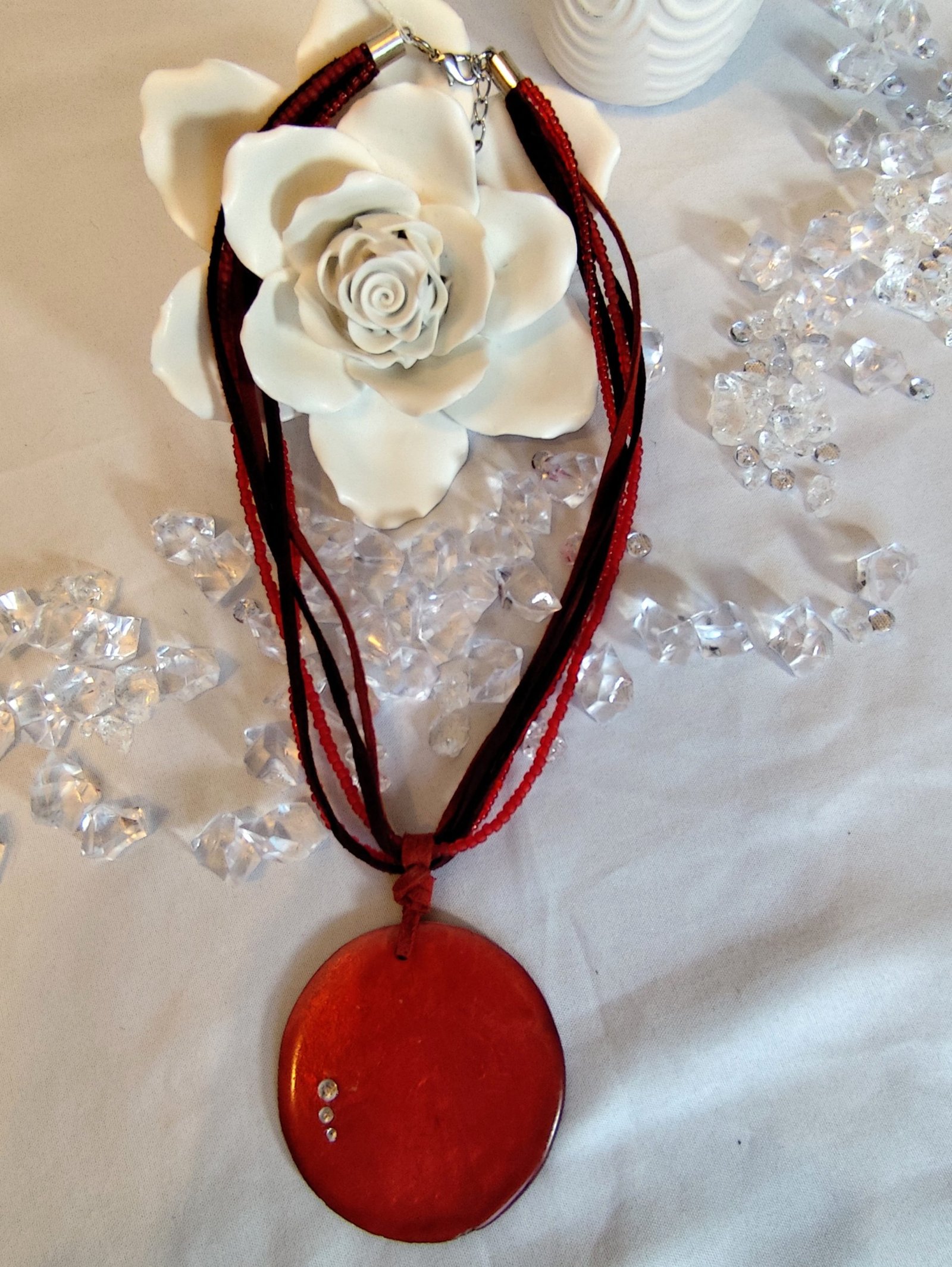 Der runde Anhänger hat einen faszinierenden Perlmutt-Effekt und wird durch glitzernde Steinchen verziert, die ihm eine besondere Eleganz verleihen. Die Kombination aus kräftigem Rot und schimmernden Akzenten sorgt für eine lebendige und einladende Ausstrahlung, die sich mühelos mit verschiedenen Outfits kombinieren lässt.