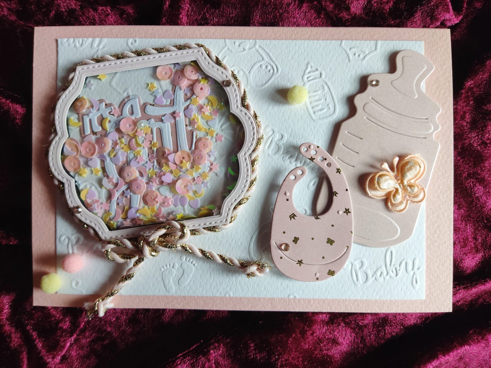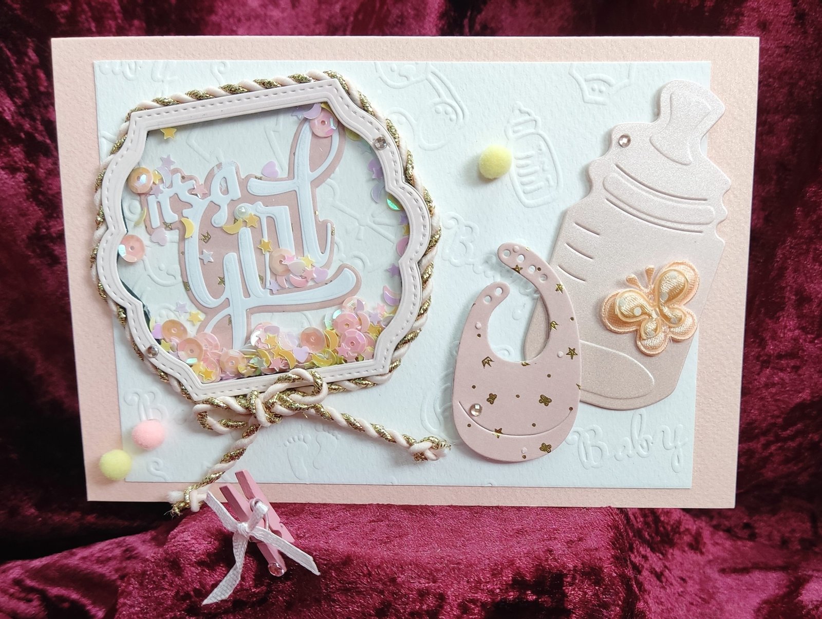 Karte in apricot, mit Perlmutteffekt, Kartenaufleger beige, mit Baby-Motiven geprägt, Schüttelkarte: Fenster mit Kordel gefasst, Schriftzug “It’s a Girl”, Füllung Pailletten und Sternchen-Streu, Motiv: Nuckelflasche und Lätzchen, Verzierung: Glitzersteinchen und Mini-Pompoms, Innenseite beige mit Geldsäckchen, mit passendem beigem Perlmutt-Umschlag