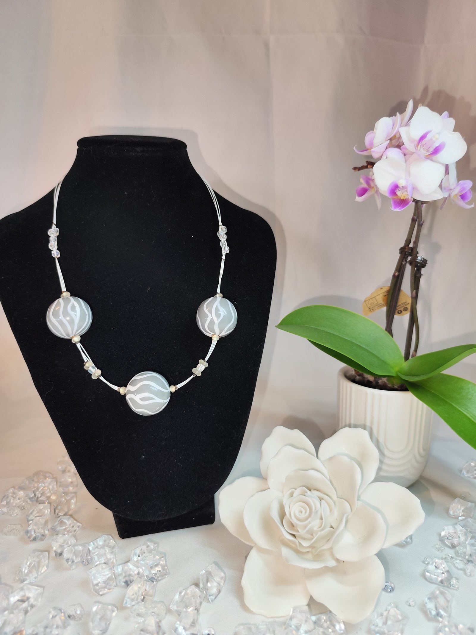 Diese Kette aus weißem Schmuckdraht, klaren Mini-Perlen, Farfalle-Perlen und grauen handbemalten Holzperlen ist ein elegantes Accessoire, das jedem Outfit eine besondere Note verleiht.
