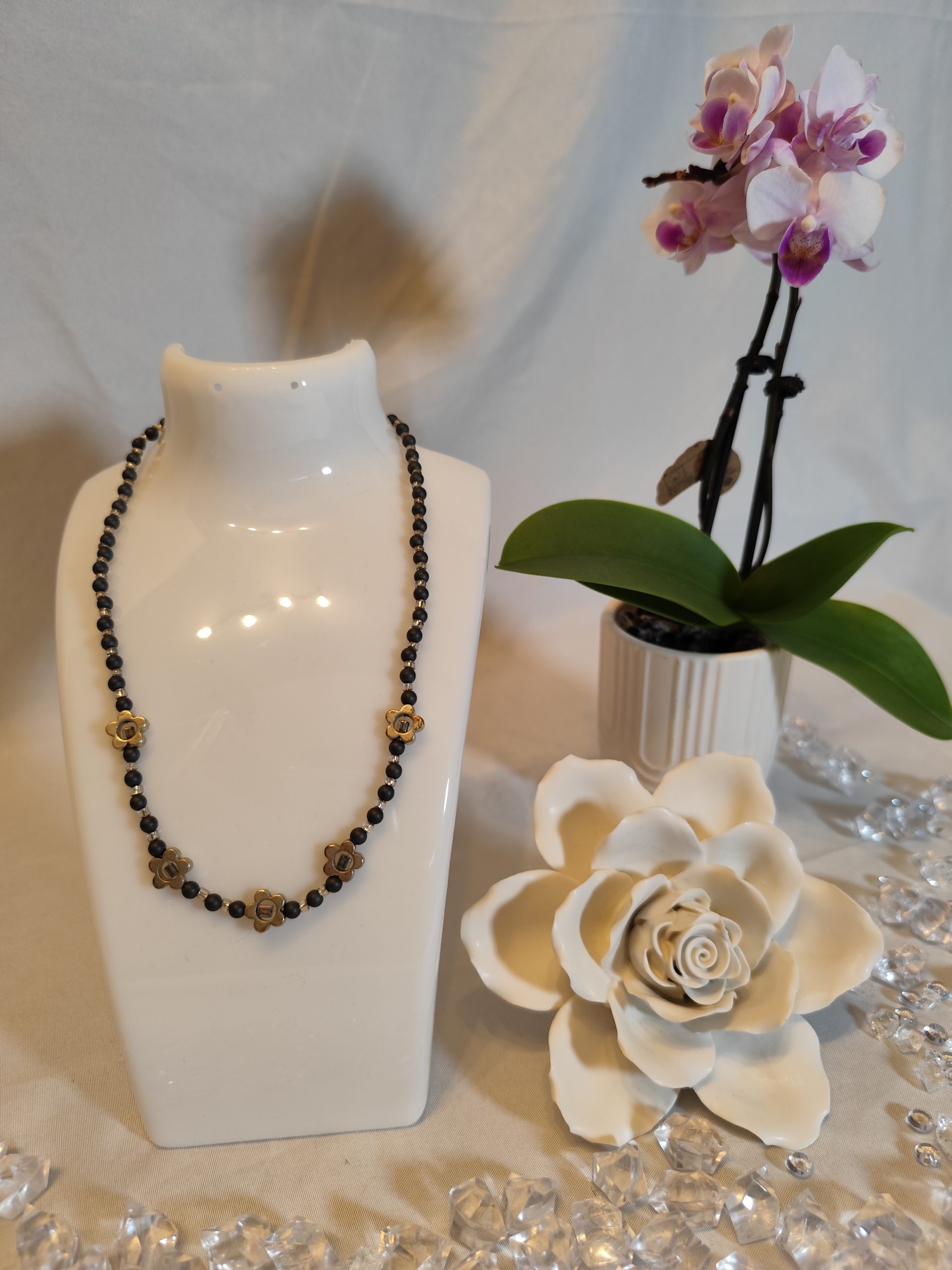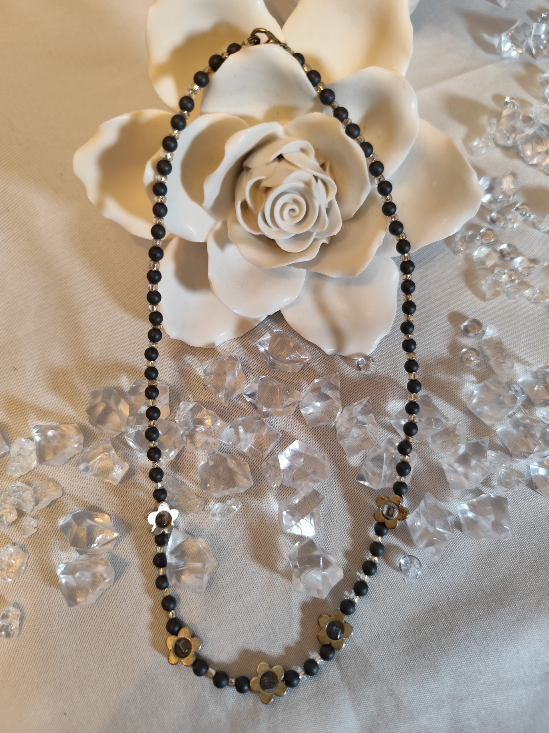 Diese Halskette kombiniert elegante Farben und Formen, um einen stilvollen Look zu kreieren. Die harmonische Mischung aus matten und klaren Perlen sowie die dekorativen Blüten-Elemente machen sie zu einem besonderen Accessoire für jeden Anlass.
