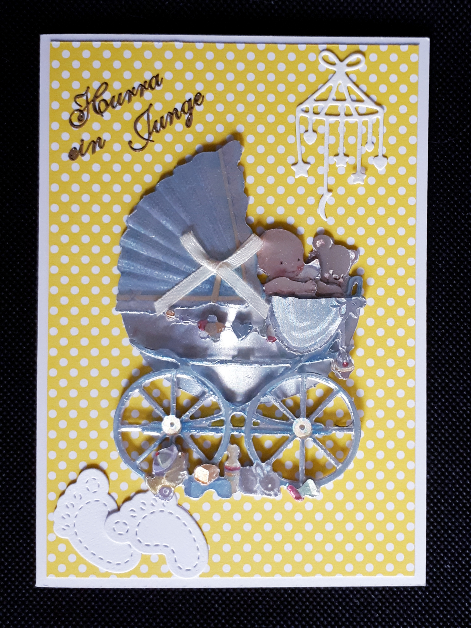 Karte in weiß, mit Perlmutteffekt, Kartenaufleger gelb mit weißen Punkten, 3D-Motiv: hellblauer Kinderwagen mit Baby in Metallic-Optik, Verzierung: Schleifchen, Füße und Mobile, Schriftzug “Hurra ein Junge”, weißer Umschlag