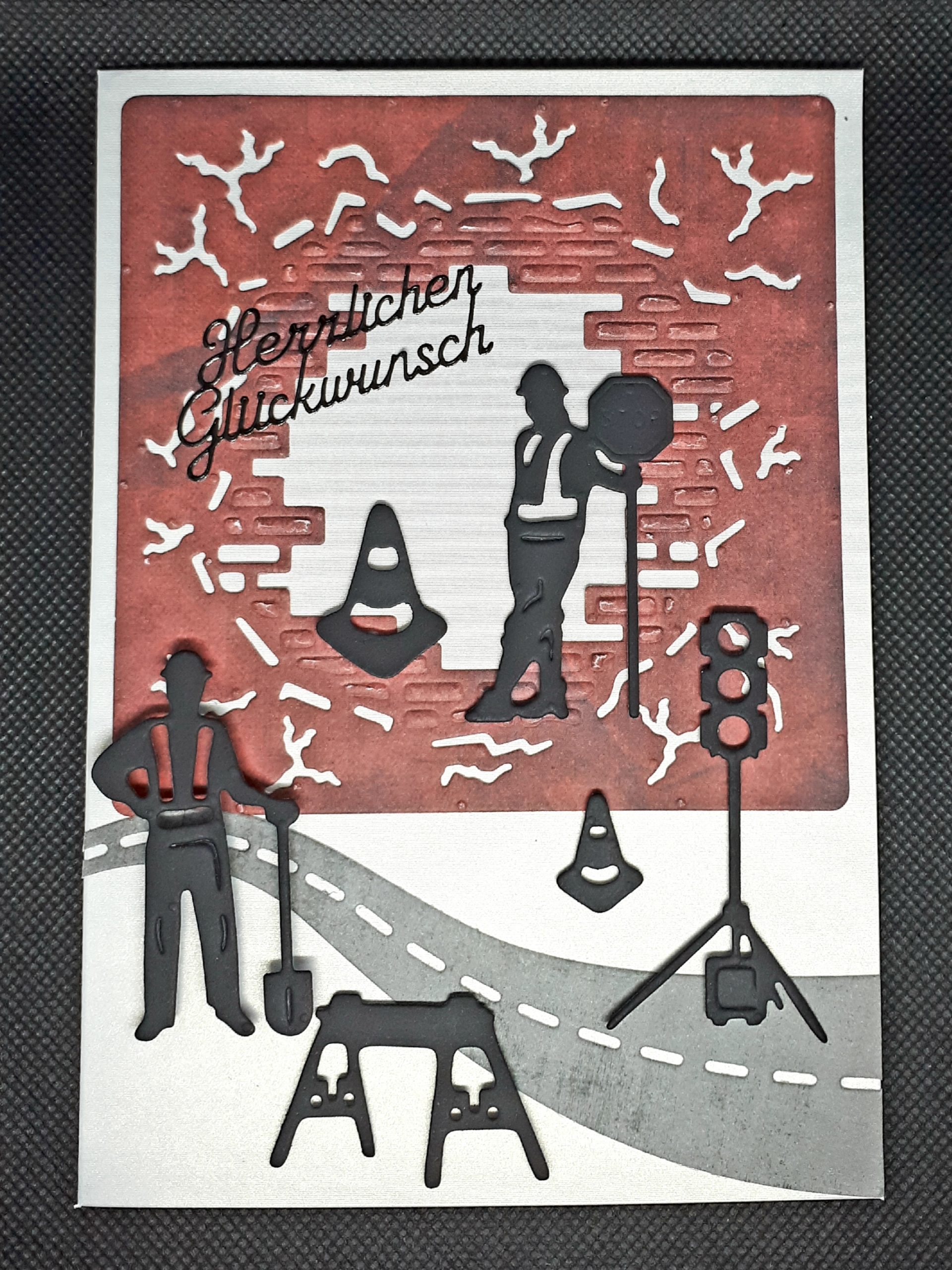 Karte in zartgrau, geprägt mit Perlmutteffekt, Kartenaufleger: Mauer mit Durchbruch, Baustellen-Szene: vorbei führende Straße, Bauarbeiter mit Ampel, Kegel und Absperrung, Schriftzug „Herzlichen Glückwunsch“, passender Umschlag mit Perlmutteffekt