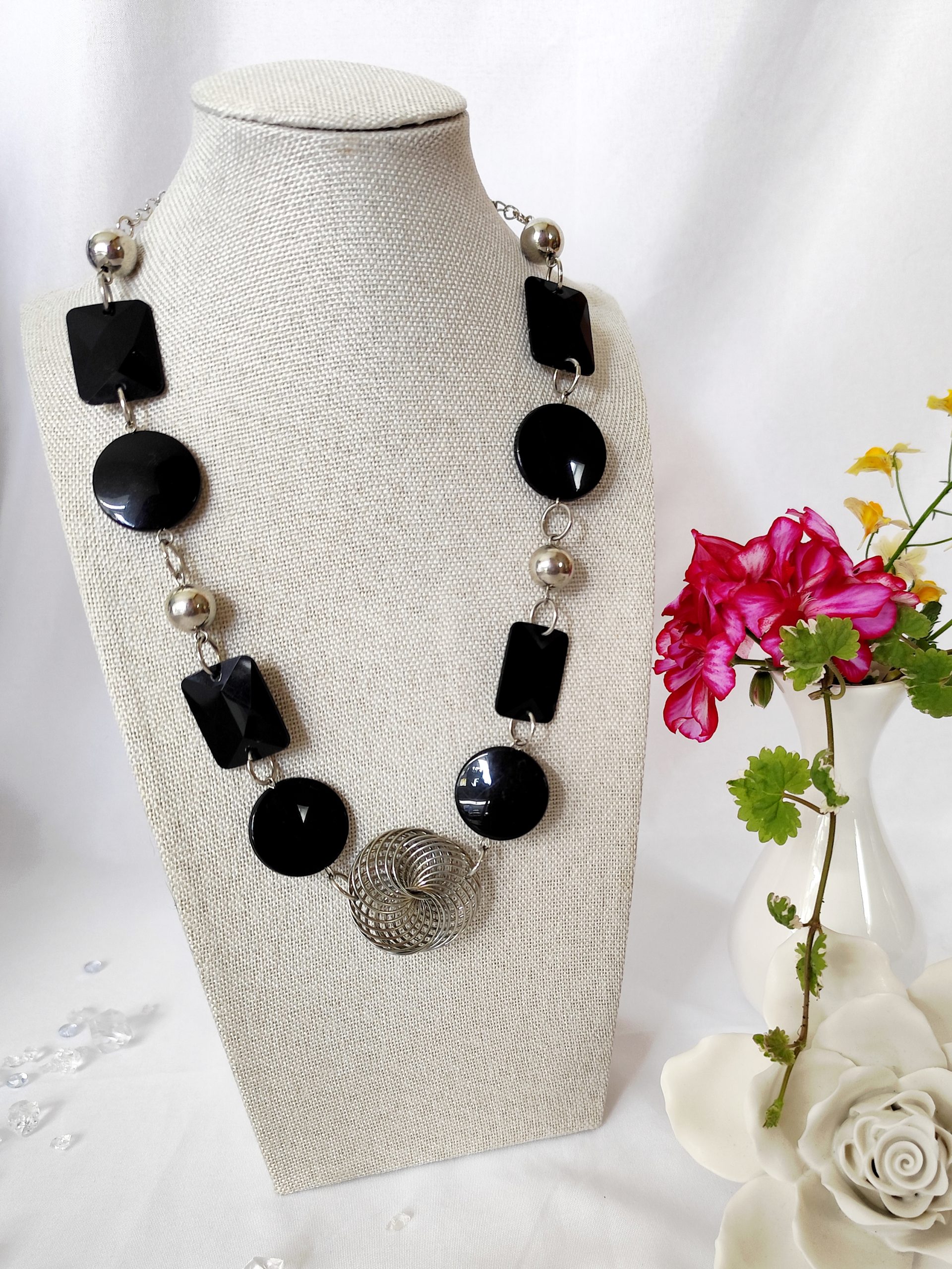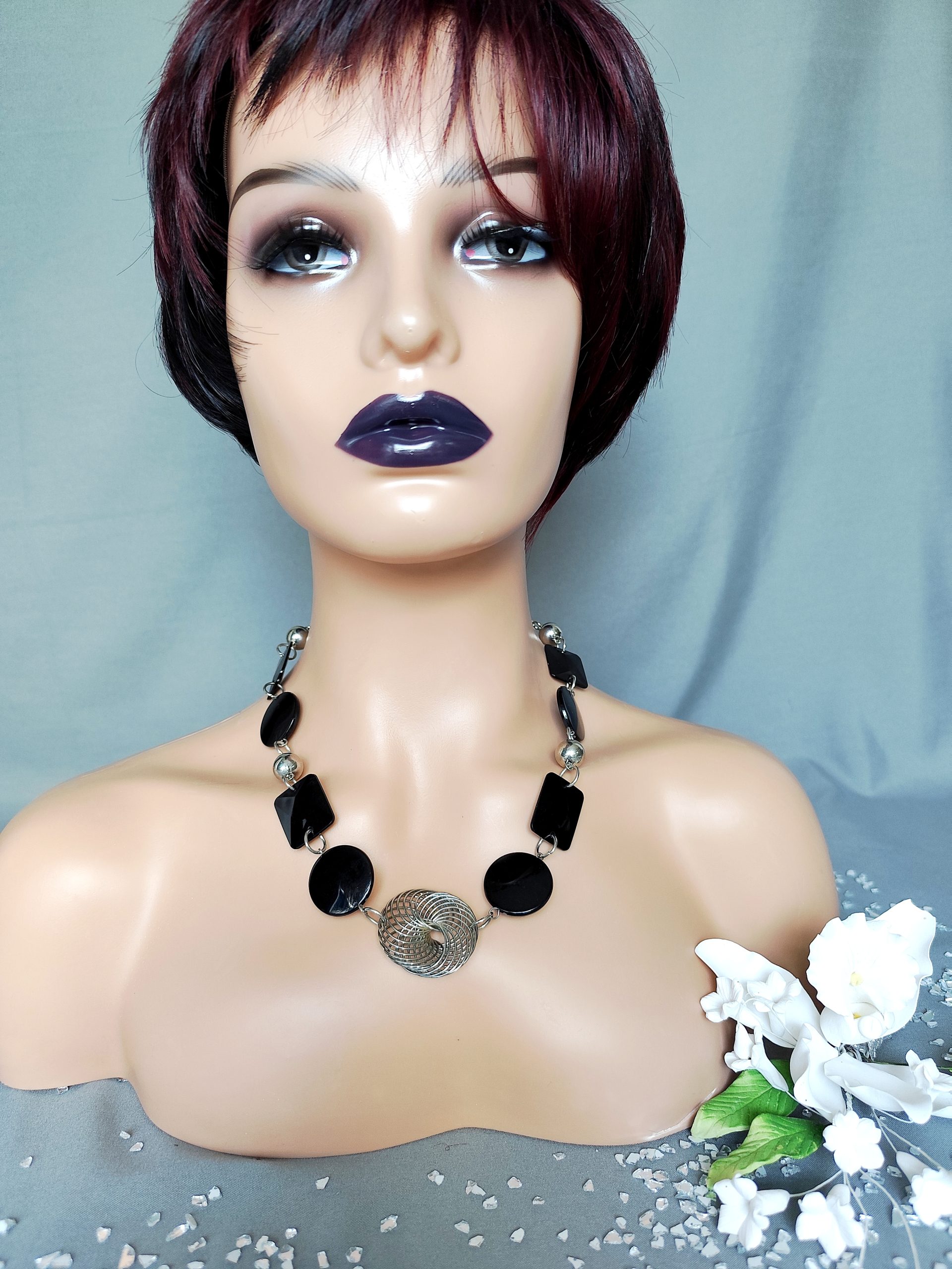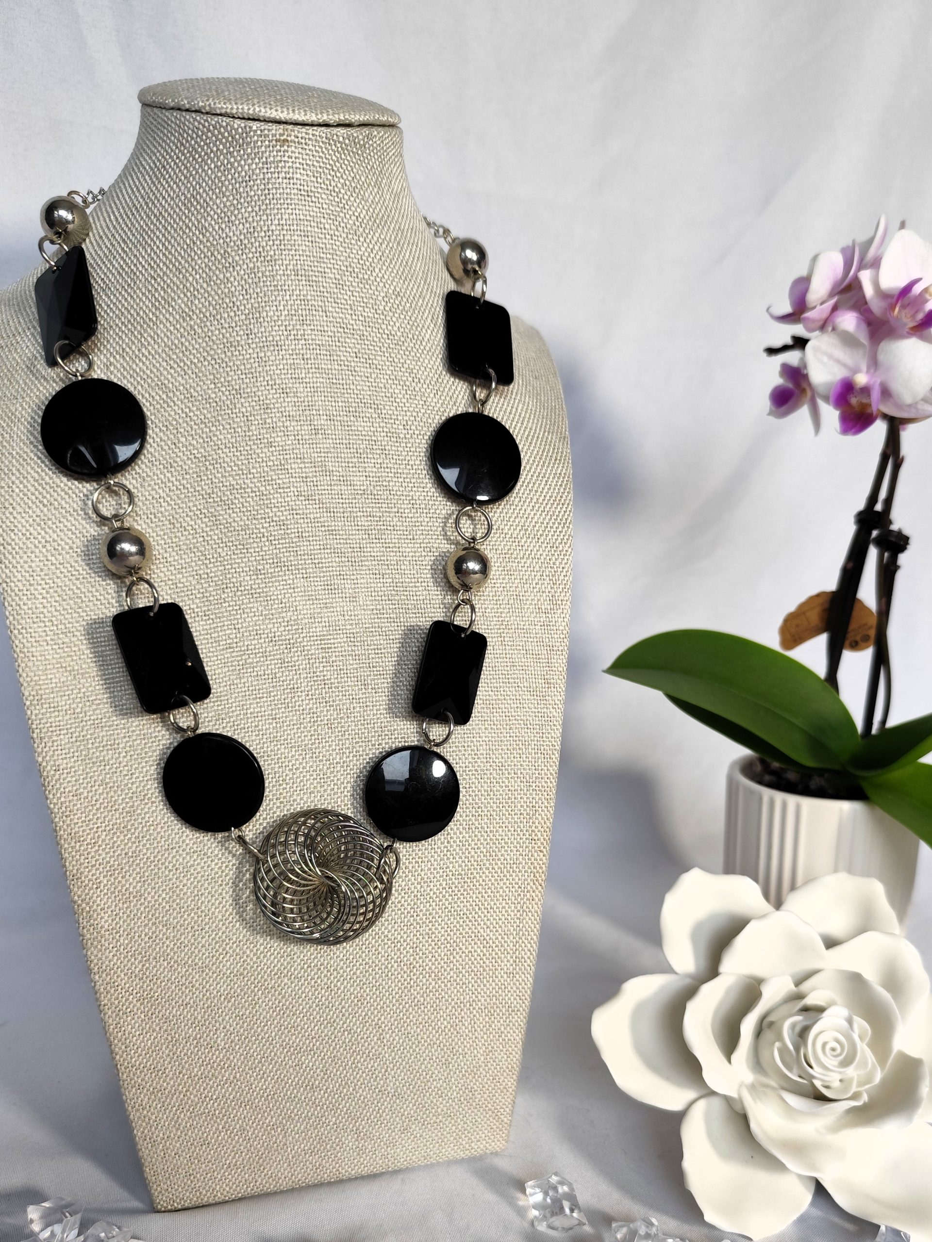 Präsentieren Sie sich mit dieser stilvollen Statement-Kette in einem eleganten Schwarz-Silber-Farbton. Die Kette besteht aus glänzenden schwarzen Acryl-Elementen, die durch silberne Verbindungsteile ergänzt werden. Das Zusammenspiel der verschiedenen Formen und Materialien verleiht der Halskette einen modernen und auffälligen Look.
