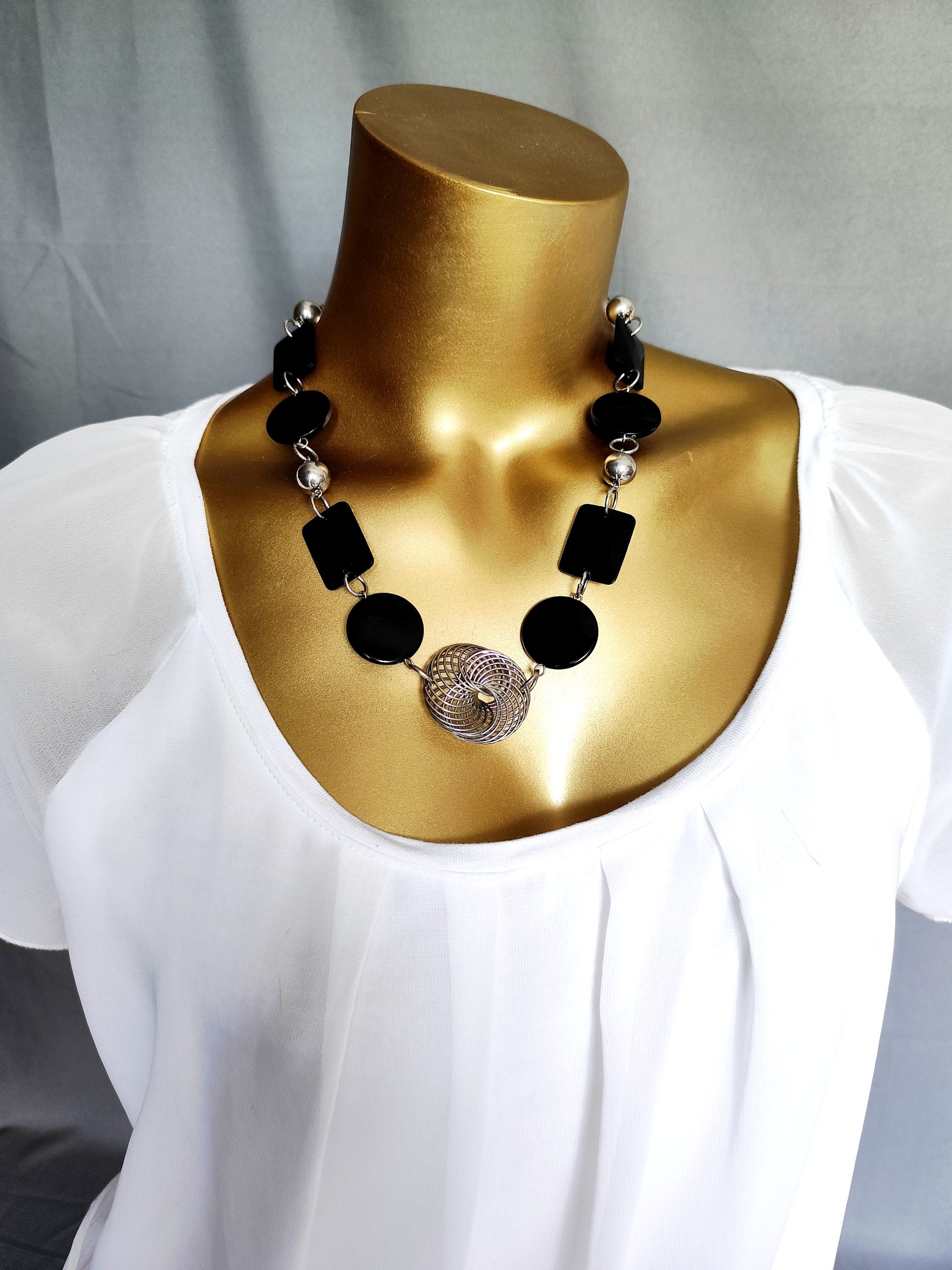 Robuste silberne Akzente, die der Kette einen eleganten Touch verleihen. Formen, darunter runde und quadratische Elemente, die harmonisch angeordnet sind. Diese Statement-Kette eignet sich hervorragend für besondere Anlässe oder um einem schlichten Outfit einen auffälligen Akzent zu verleihen. Sie ist perfekt, um Ihren persönlichen Stil zu unterstreichen und dabei die Blicke auf sich zu ziehen.