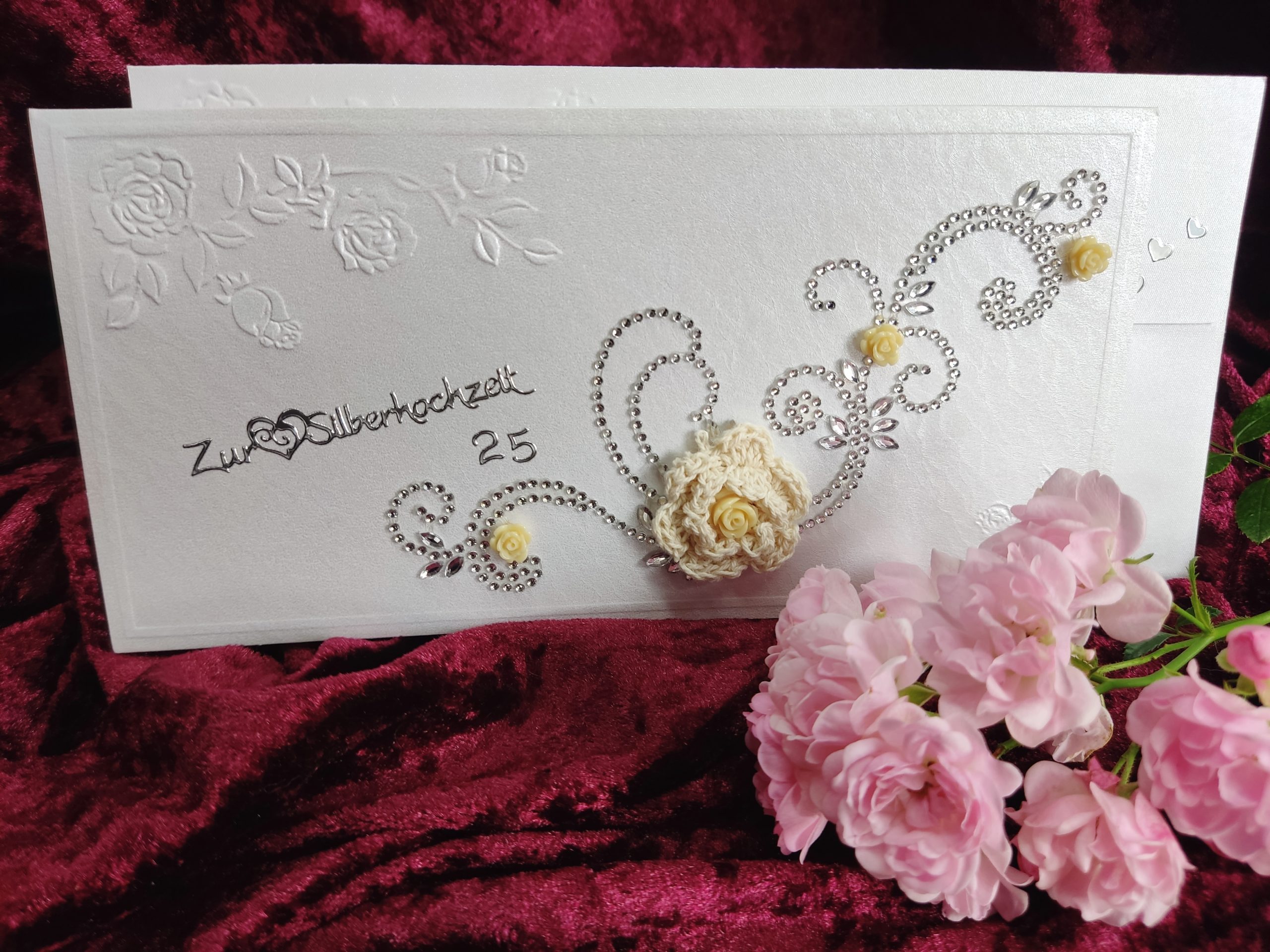 Karte in weiß, mit geprägtem Rosen-Motiv und mit Perlmutteffekt, aufwendiges Glitzerstein-Motiv mit edler Häkel-Blüte, Schriftzug “Zur Silberhochzeit 25”, passender Perlmutt-Umschlag, geprägt mit Rosen-Motiv