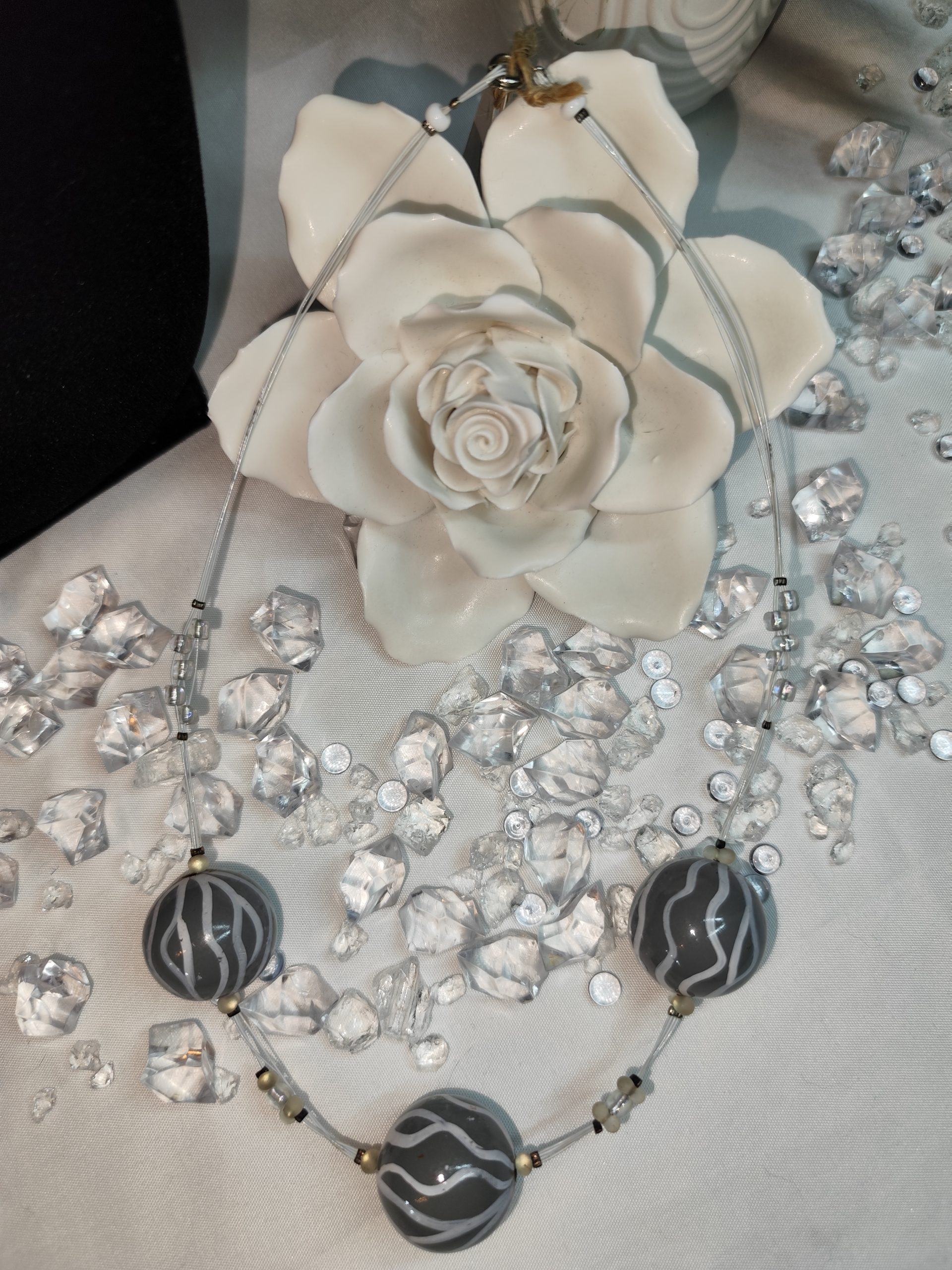 Diese Kette aus weißem Schmuckdraht, klaren Mini-Perlen, Farfalle-Perlen und grauen handbemalten Holzperlen ist ein elegantes Accessoire, das jedem Outfit eine besondere Note verleiht.